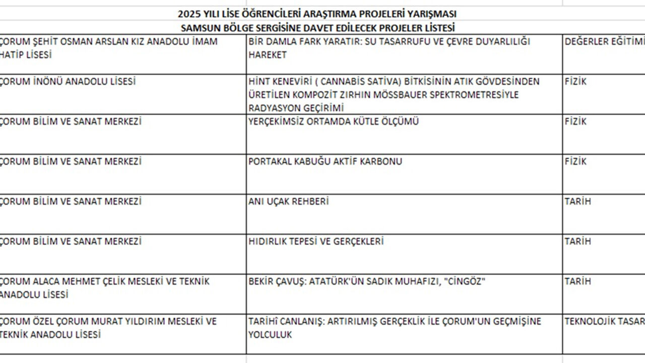 Bu yıl düzenlenen yarışmada, Çorum’dan seçilen projeler arasında farklı alanlarda dikkat çeken projeler bulunuyor. Fizikten tarihe, çevre duyarlılığından teknolojik tasarıma kadar geniş bir yelpazeye yayılan projeler, Çorumlu öğrencilerin bilimsel yeteneklerini gözler önüne seriyor. Samsun’da gerçekleştirilecek olan bölge yarışmasına katılacak projeler ve okullar şu şekilde sıralanıyor: